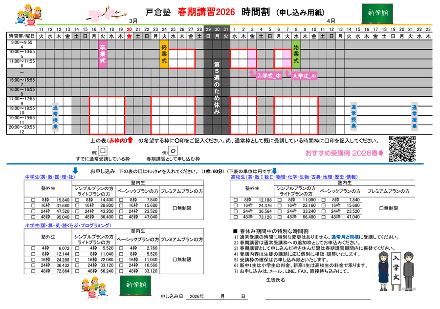 春期講習 おすすめ!受講例はこちら 申込用紙のダウンロードはこちら お申込みは、LINE、メール、FAX、用紙を持ち込み (用紙は教室2Fのとびらに置きます) お問い合わせは LINE、 お問合せページから。
