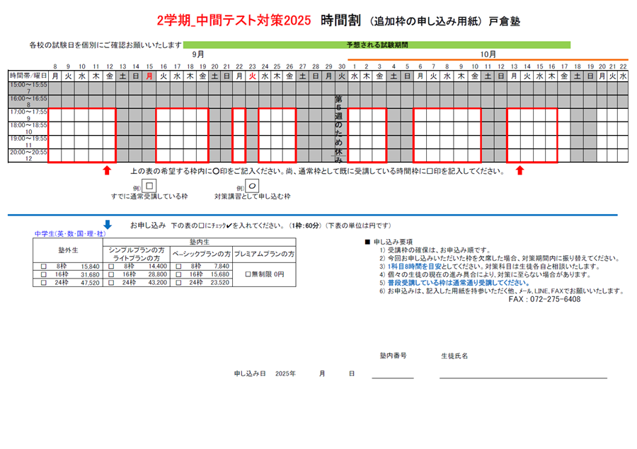 ■塾内生用の申込用紙です。まだ入塾いただいていない方は、別途お問い合わせください。